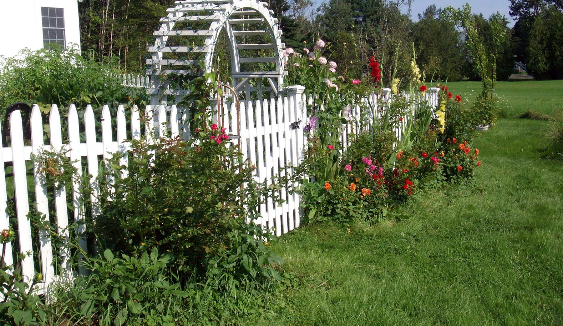 | Dahlias, roses, gladiolas, and clematis frame the back fence. | |||||||||||||||||||||||||||||||||||